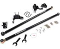 Upgrading the factory stamped steel radius arms this system converts over to a true 4-link design to improve drivability, performance and strength. The heavy duty 1/4" thick steel frame mounted 4-link brackets bolt into factory holes to allow the four massive tubular control arms to be installed. These arms are build from 2" OD x .250" wall tubing with large greaseable bushings. 4-link design optimizes the front suspension geometry and reduces caster change through wheel travel to less than 1-degree.